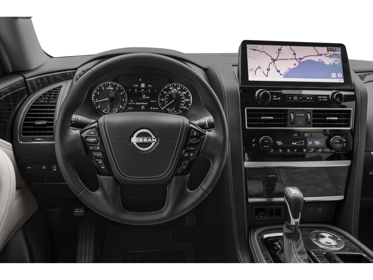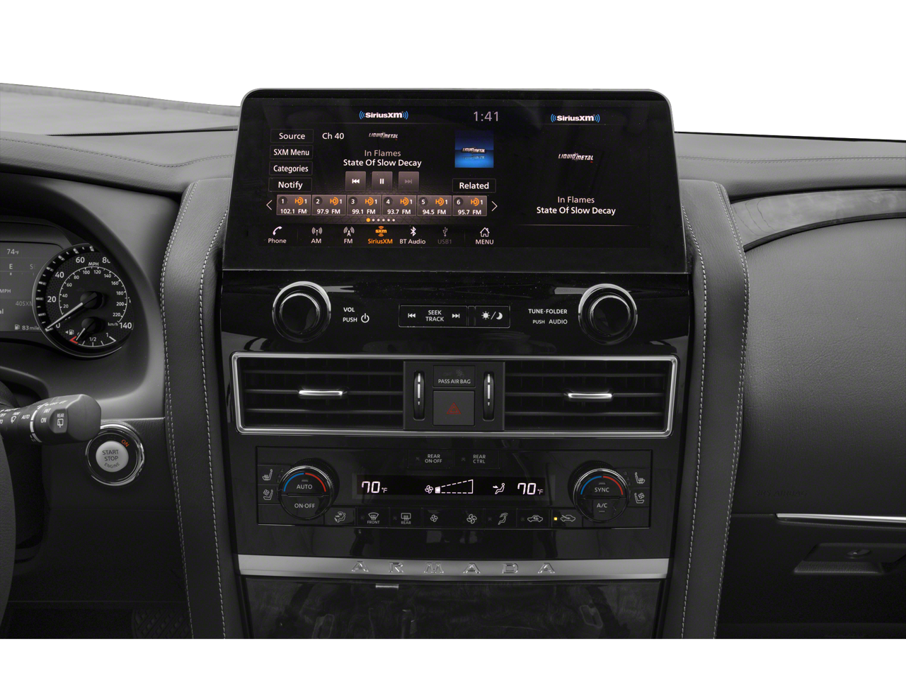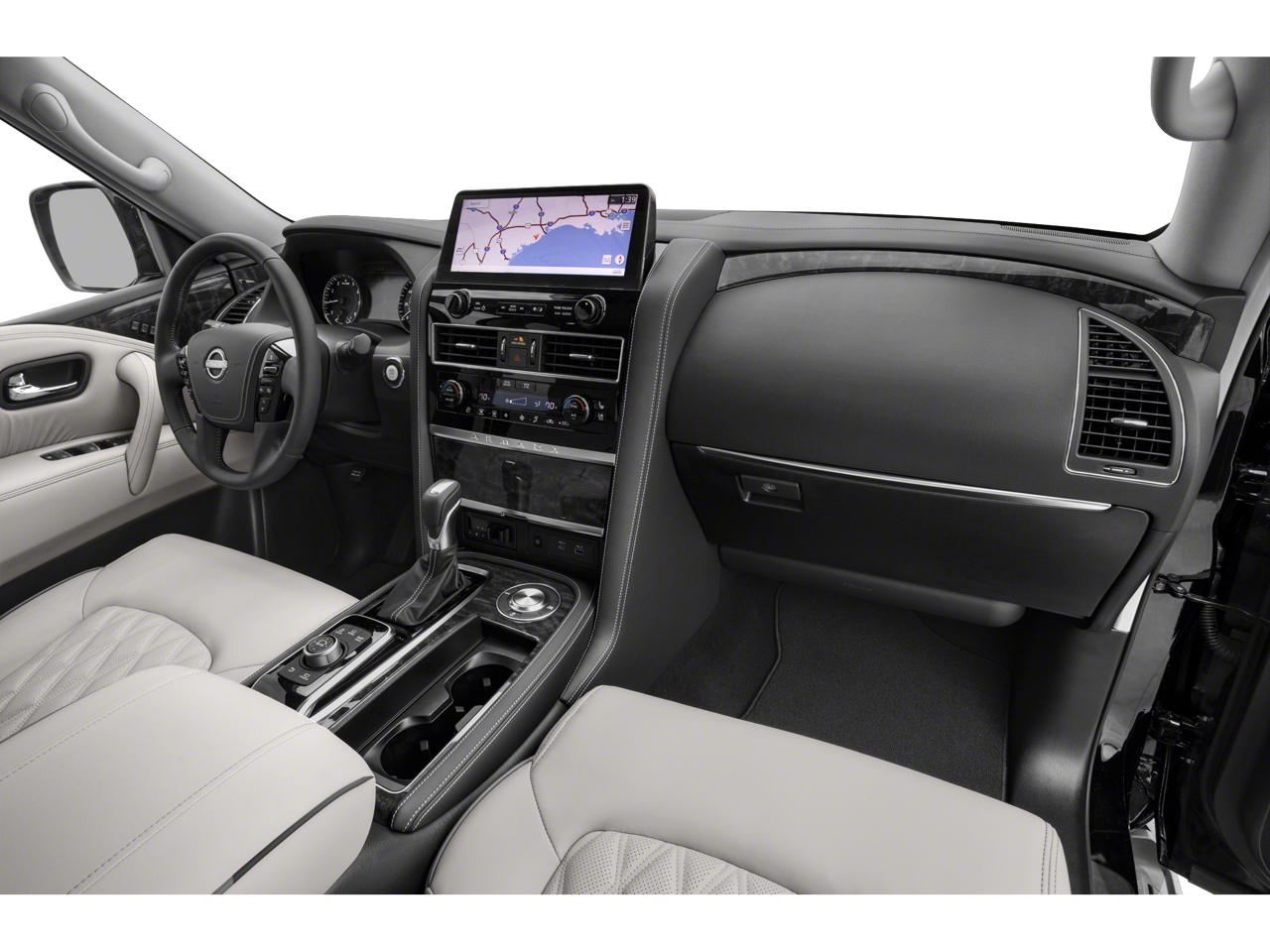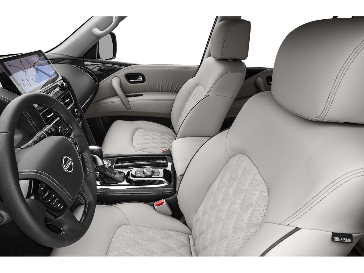 Captain's Chairs Package (2nd Row Captain's Chairs and 2nd Row Center Console w/Padded Armrest), Cargo Package, Nissan Certified Certified, 4WD, 13 Speakers, 2.937 Axle Ratio, 3rd Row Carpeted Floor Mats - Captain Seat, 3rd row seats: split-bench, 4-Wheel Disc Brakes, ABS brakes, Air Conditioning, Alloy wheels, AM/FM radio: SiriusXM, Anti-whiplash front head restraints, Auto High-beam Headlights, Auto tilt-away steering wheel, Auto-dimming door mirrors, Auto-dimming Rear-View mirror, Auto-leveling suspension, Automatic temperature control, Brake assist, Bumpers: body-color, Climate-Controlled Front Bucket Seats, Delay-off headlights, Driver door bin, Driver vanity mirror, Dual front impact airbags, Dual front side impact airbags, Electronic Stability Control, Emergency communication system: NissanConnect Services, Exterior Parking Camera Rear, Four wheel independent suspension, Front anti-roll bar, Front Bucket Seats, Front Center Armrest, Front dual zone A/C, Front fog lights, Front reading lights, Fully automatic headlights, Garage door transmitter: HomeLink, Heated door mirrors, Heated front seats, Heated rear seats, Heated steering wheel, HVAC memory, Illuminated entry, Illuminated Kick Plates, Illuminated Scuff Plate, Knee airbag, Leather Shift Knob, Leather steering wheel, Low tire pressure warning, Memory seat, Navigation System, Nissan USB Charging Cable Set, Occupant sensing airbag, Outside temperature display, Overhead airbag, Overhead console, Panic alarm, Passenger door bin, Passenger vanity mirror, Power door mirrors, Power driver seat, Power Liftgate, Power moonroof, Power passenger seat, Power steering, Power windows, Quilted Leather Seat Trim, Radio: NissanConnect w/SiriusXM, Rain sensing wipers, Rear air conditioning, Rear anti-roll bar, Rear rea